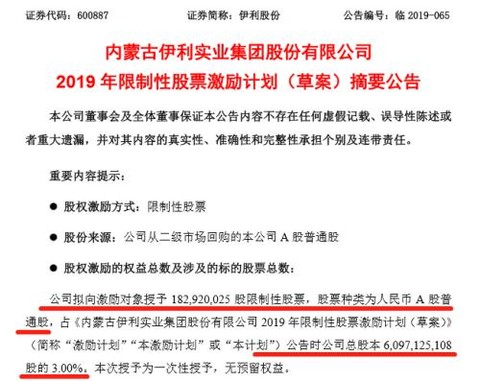 8月5日晚间,伊利股份发布了2019年限制性股票激励计划(草案),拟向激励对象授予公司限制性股票总计1.83亿股,股票种类为人民币A股普通股,占公司总股本的3%,授予价格为15.46元/股。