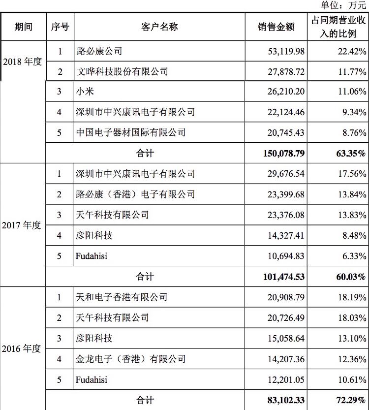 其中,排名前五的客户应收账款余额合计分别为0.65亿元、1.37亿元、2.39亿元,占应收账款余额的比例分别为100%、95.26%、98.85%,占比过高。而在这些客户中,不乏小米、TCL、创维等的身影。