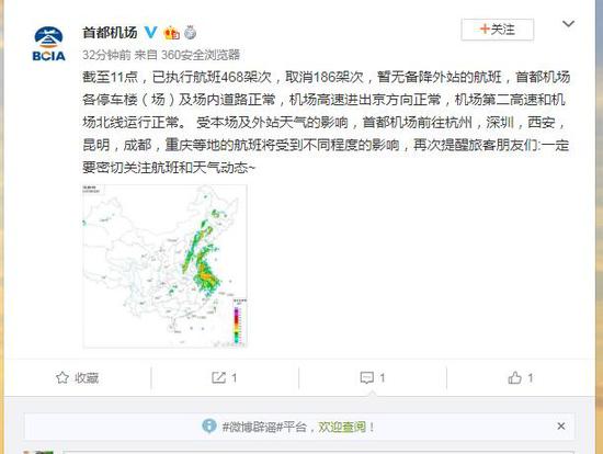截至11点,已执行航班468架次,取消186架次,暂无备降外站的航班,首都机场各停车楼(场)及场内道路正常,机场高速进出京方向正常,机场第二高速和机场北线运行正常。 受本场及外站天气的影响,首都机场前往杭州,深圳,西安,昆明,成都,重庆等地的航班将受到不同程度的影响,再次提醒旅客朋友们:一定要密切关注航班和天气动态~