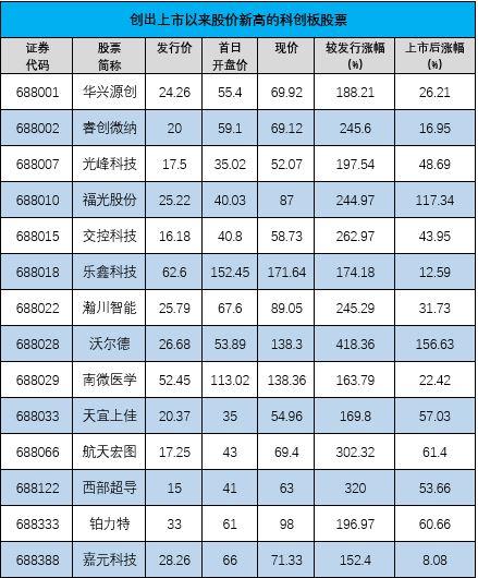 截至8月2日收盘,已有14只个股股价创出上市以来的新高。沃尔德(688028)最为突出,现股价较发行价上涨418.36%,单以上市后计算,涨幅也已翻倍,达到了156.63%。