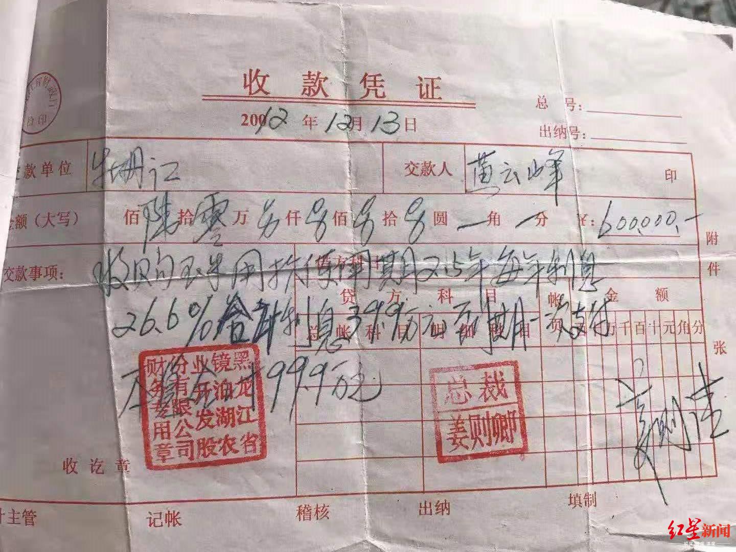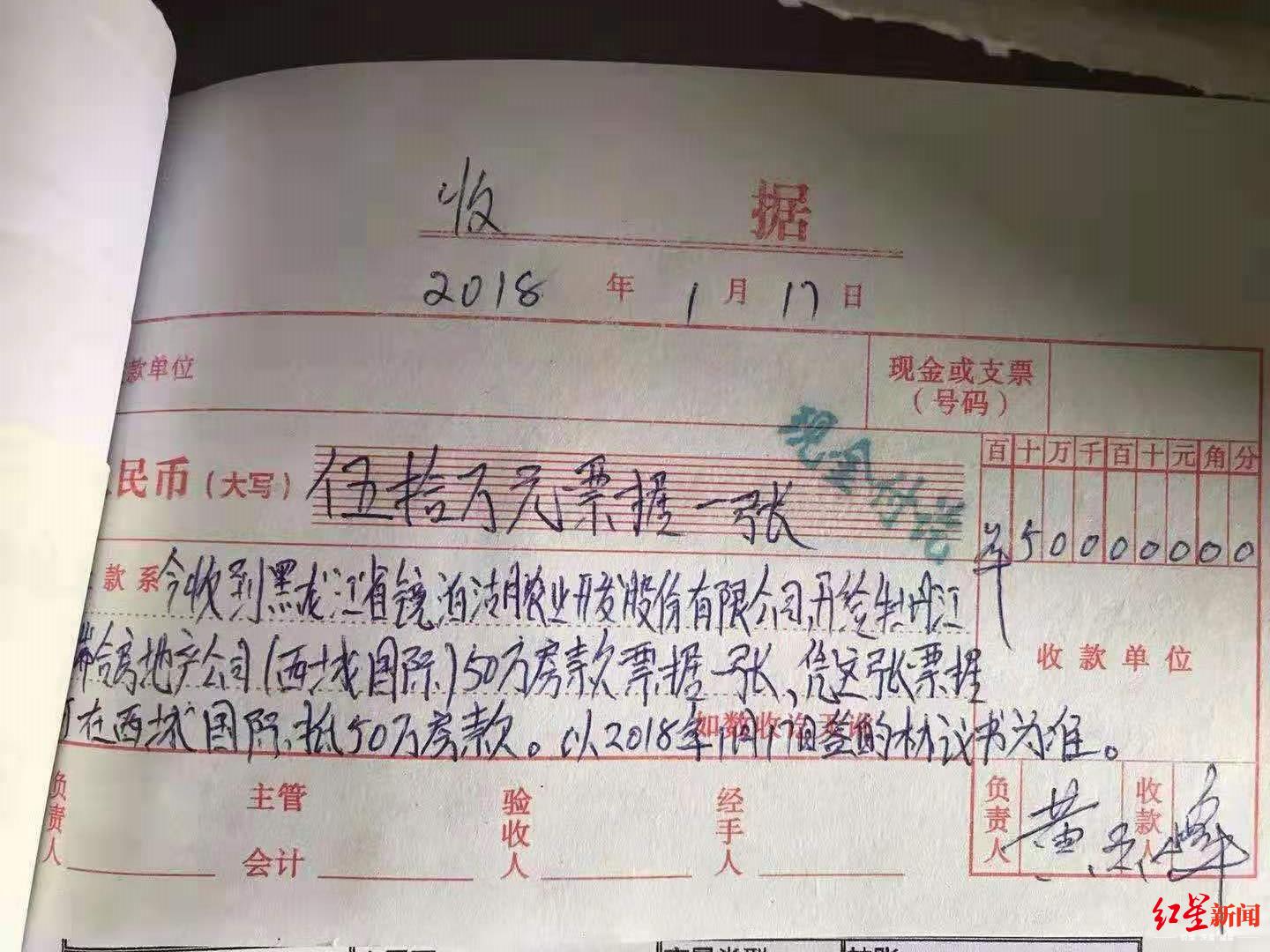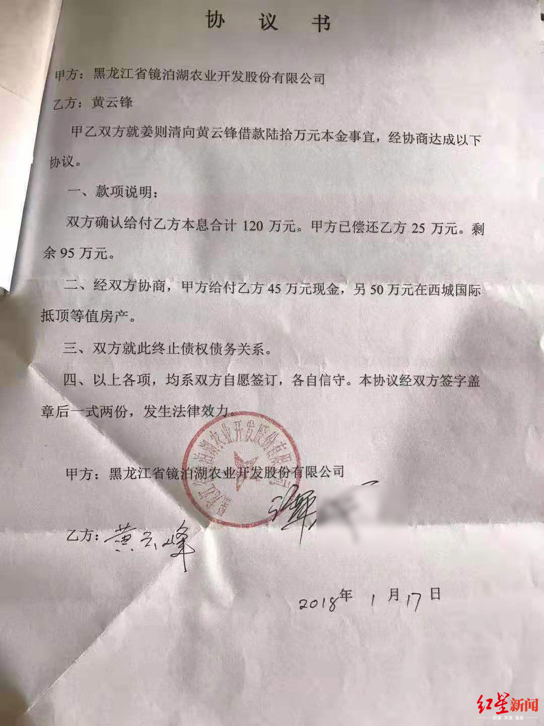 谭某家属称,黑龙江渤海集团于2012年12月13日以黑龙江省镜泊湖农业开发股份有限公司的名义,向黄云峰借款共计60万元。红星新闻从其提供的收款凭证上看到,交款人为黄云峰,还款本息合计金额为99.9万元;借款6年后,双方协商累计欠款金额共120万元交付给黄云峰,由于前期已归还25万元,剩余的95万元中,50余万以房子形式顶替,剩余款项45万约定五个月内归还完毕,并已签下合同。
