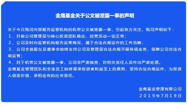 对于上述公文,金鹰基金7月19日晚间在官方微信公众号上发布《关于公文被泄露一事的声明》。