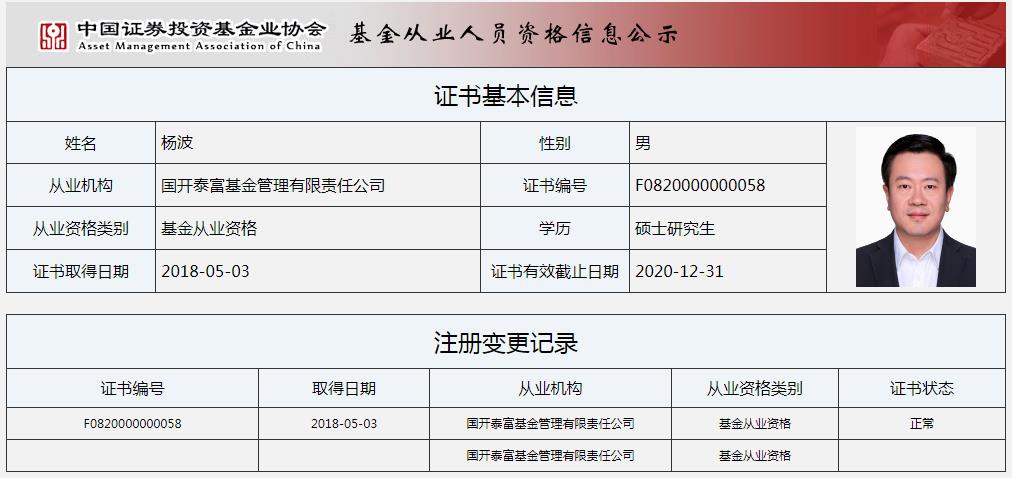 公开资料显示,杨波,1997年7月至2001年9月,任职于天津磁卡股份有限公司;2004年8月至2015年2月,任职于中信证券股份有限公司;2015年3月至2018年3月,任职于泰康资产管理有限责任公司;2018年4月至2019年8月1日,就职于国开泰富基金。