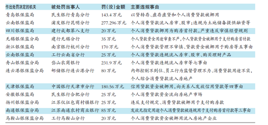 例如,据云南银保监局7月21日披露,工行云南省分行因“个人消费贷款违规流入房市、股市、购买理财产品”被罚25万元;建行成都第八支行今年3月因“个人消费贷款挪用为购房首付款,严重违反审慎经营规则”被罚20万元;江苏仪征包商村镇银行今年1月因“违反支付规定、消费贷款被挪用于支付购房款”被罚25万元。