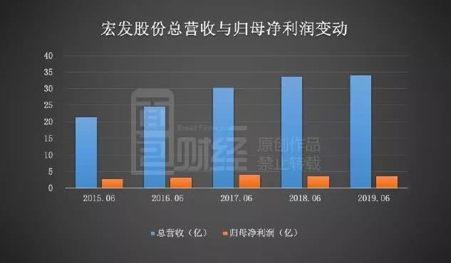 宏发股份于2013年借壳上市,主要从事继电器、自动化设备及相关的电子元器件、机电产品、机械设备的生产和销售。2017开始,公司陷入增收不增利的局面,至2019上半年,公司营收34.07亿,同比增长1.53%,但归母净利润约3.55亿,同比下滑3.42%。