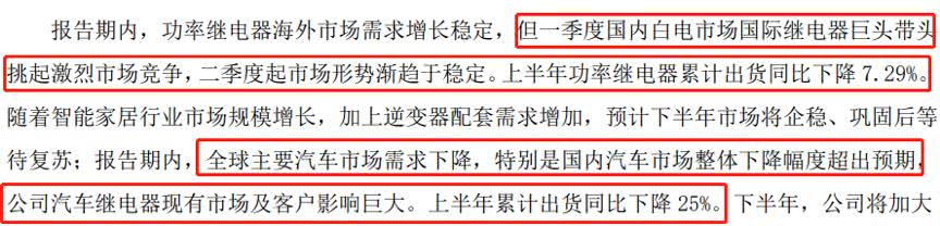 公司在财报中表示上半年电力继电器、高压直流、工控、密封继电器等产品较快增长;但功率继电器及汽车继电器则出现了较为明显的下滑,报告期内出货量同比分别下滑约7.29%和25%。