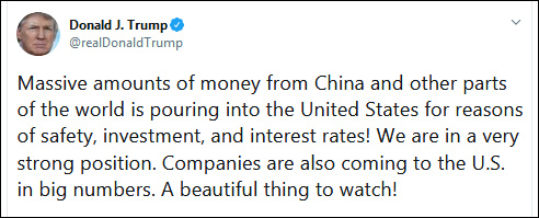 “为了安全、投资和利率,来自中国和世界其他地方的大量资金正在涌入美国!我们处于一个非常强的位置上。许多公司也正在来到美国,这是一件非常可观的美妙事情。”
