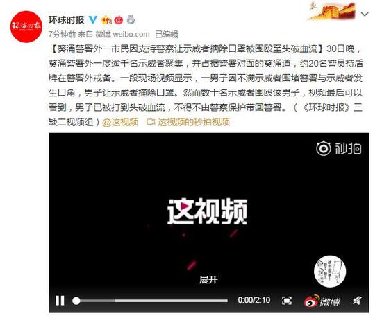 [葵涌警署外一市民因支持警察让示威者摘除口罩被围殴至头破血流]30日晚,葵涌警署外一度逾千名示威者聚集,并占据警署对面的葵涌道,约20名警员持盾牌在警署外戒备。一段现场视频显示,一男子因不满示威者围堵警署与示威者发生口角,男子让示威者摘除口罩。然而数十米示威者围殴该男子,视频最后可以看到,男子已被打到头破血流,不得不由警察保护带回警署。