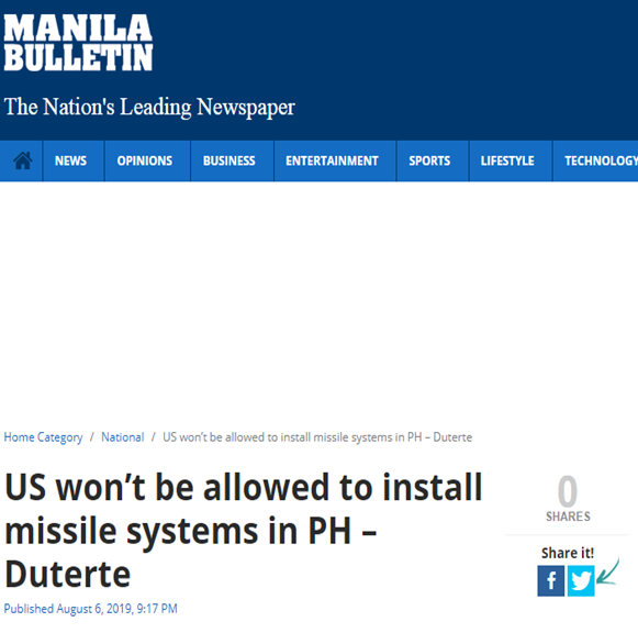据菲律宾《马尼拉公报》报道,杜特尔特当天在马拉卡南宫举行的菲华商界领袖聚会前表示,“报纸上有一篇文章说,他们(美国)将(在亚洲)部署一些路基中程导弹。这永远不可能发生。”