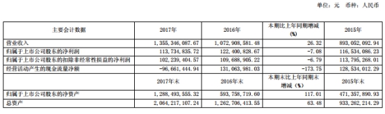 上市当年,亚士创能净利润下滑。2017年,公司的营业收入为13.55亿元,同比增长26.32%;归属于上市公司股东的净利润为1.14亿元,同比减少7.08%;归属于上市公司股东的扣除非经常性损益的净利润为1.02亿元,同比减少6.79%;经营活动产生的现金流量净额为-9666.14万元,同比减少173.75%;主营业务毛利率为31.01%,比上年同期减少5.13个百分点。