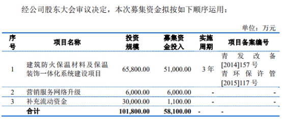 亚士创能上市时披露的公告书显示,公司以每股12.94元的价格发行不超过4900.00万股,募集资金总额为6.34亿元,扣除发行费用募集资金净额为5.81亿元。其中,5.10亿元用于建筑防火保温材料及保温装饰一体化系统建设项目;6000.00万元用于营销服务网络升级;1100.00万元用于补充流动资金。
