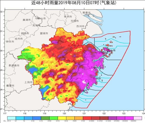 降雨方面,“利奇马”的影响仍在线。今天浙北及台州、金华地区仍有暴雨,部分大暴雨,局地特大暴雨。