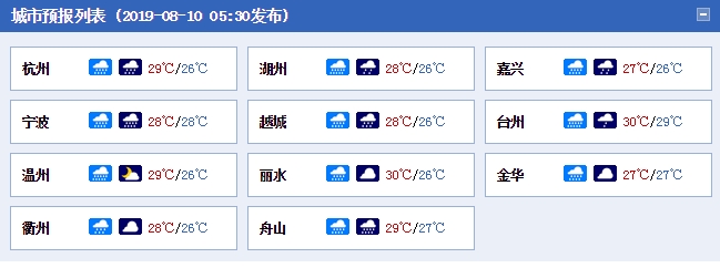 具体来看,今天,浙北及台州、金华地区有暴雨,部分大暴雨,局地特大暴雨;其它地区阴有中到大雨,部分暴雨。白天最高温度,全省28-30℃;明晨最低温度,全省25-27℃。