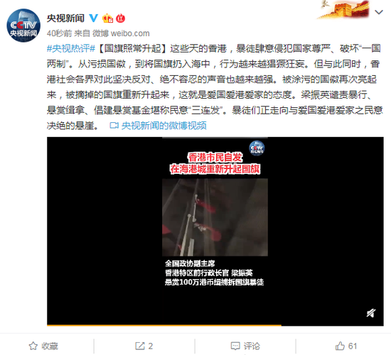 #央视热评#[国旗照常升起]这些天的香港,暴徒肆意侵犯国家尊严、破坏“一国两制”。从污损国徽,到将国旗扔入海中,行为越来越猖獗狂妄。但与此同时,香港社会各界对此坚决反对、绝不容忍的声音也越来越强。被涂污的国徽再次亮起来,被摘掉的国旗重新升起来,这就是爱国爱港爱家的态度。梁振英谴责暴行、悬赏缉拿、倡建悬赏基金堪称民意“三连发”。暴徒们正走向与爱国爱港爱家之民意决绝的悬崖。