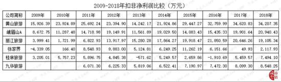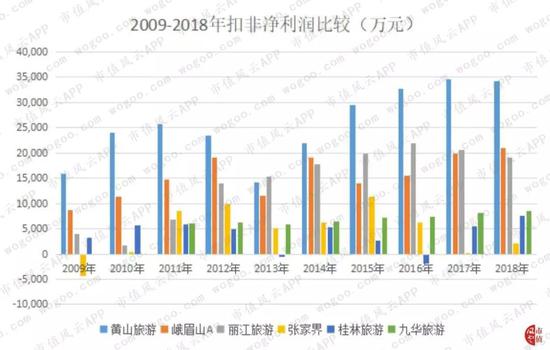 黄山旅游虽然领先另外5家公司,但其扣非净利润在3.5亿元附近遇到明显天花板;