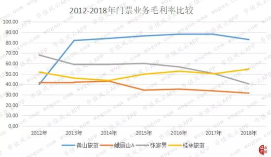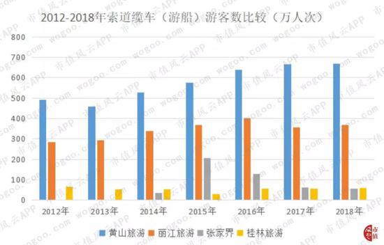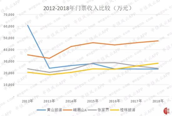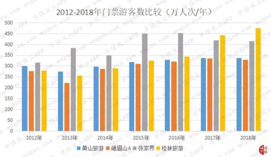 从上图表不难看出,2012-2018年,桂林旅游的门票游客逐年增长,2018年达到476万人次的峰值;其次是张家界,其峰值出现在2016年452万人次;2014年以来,黄山旅游和峨眉山A的门票游客数相差不大,最近3年分别稳定在335万、330万左右。