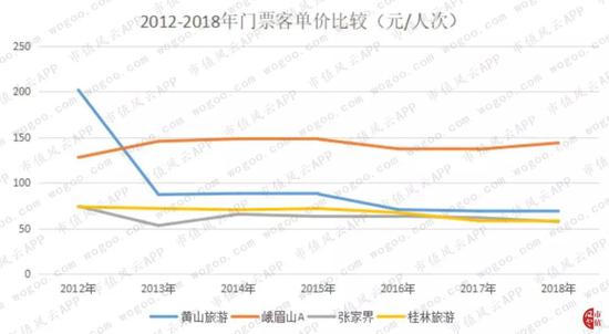 从客单价看,峨眉山A的客单价最高,2012-2018年均接近140元/人次,且客单价比较坚挺;