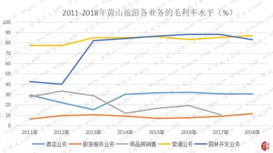 黄山旅游的酒店业务收入呈现不断上涨趋势,2018年占比近40%;索道业务收入占比也呈现增长态势,2018年占比近1/3;其次是旅游服务(旅行社)业务,占比达1/4,但该业务的毛利率很低,不到10%;值得注意的是,园林开发业务的收入占比下滑很明显,从2011年的36%下滑到2018年的14.25%。