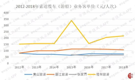 从上方可以清晰看出,黄山旅游的索道业务的游客数量对多,并且保持稳定的增长态势;丽江旅游的索道的游客数也比较多,但400万人次/年似乎就到了天花板;张家界的索道游客数量波动非常大;桂林旅游的游船的游客数在2015年触底后,最近3年快速回复,但60万似乎也是其接待能力的天花板。