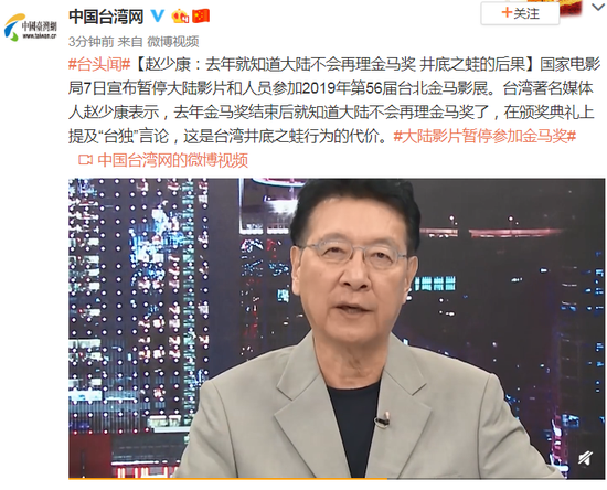 国家电影局7日宣布暂停大陆影片和人员参加2019年第56届台北金马影展。台湾著名媒体人赵少康表示,去年金马奖结束后就知道大陆不会再理金马奖了,在颁奖典礼上提及“台独”言论,这是台湾井底之蛙行为的代价。