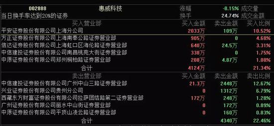 今年7月10日,中小板公司惠威科技现身龙虎榜。当日平安证券上海分公司以2032万元的买入额位列公司龙虎榜单之首,信达证券上海虹口区海伦路营业部则以640万买入额位列公司买入金额排名前5的营业部的第三位。