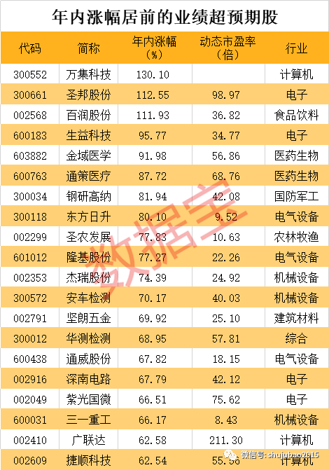 具体来看,万集科技、圣邦股份、百润股份3股年内涨幅翻倍;生益科技、金域医学、通策医疗、钢研高纳、东方日升5股年内涨幅均超80%。
