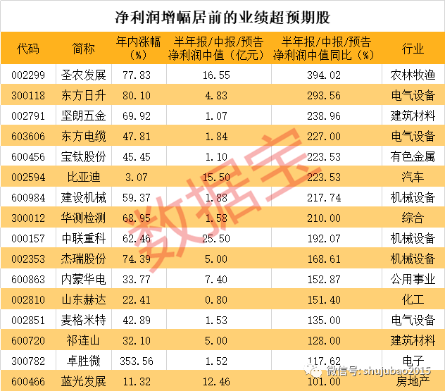业绩超预期个股多数绝大部分上半年净利润实现了高速增长,数据宝统计显示,按照半年报、快报、预告净利润中值计算,超过六成业绩超预期股净利润同比增长超40%,有16只股票净利润增幅超过100%。