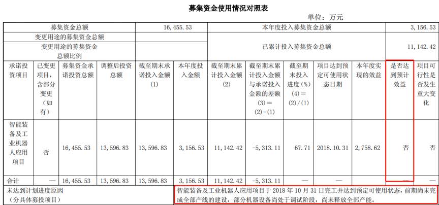 然而根据公司2019年3月发布的募集资金存放与实际使用情况的专项报告,公司IPO募资承诺投资额约1.65亿,已累计投入募资总额约1.11亿,募资累计投入比例约67.27%。公司募投的智能装备及工业机器人应用项目于2018年10月底达到预定可使用状态,但“前期尚未完成全部产线的建设,部分机器设备尚处于调试阶段,尚未释放全部产能”,项目未达预计效益。