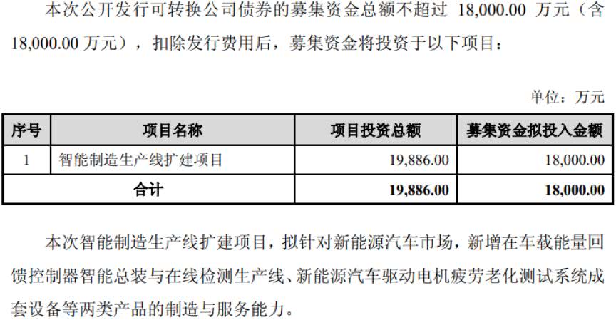 目前公司正筹划发行可转换公司债券,拟募资约1.8亿,用于智能制造生产线扩建项目。