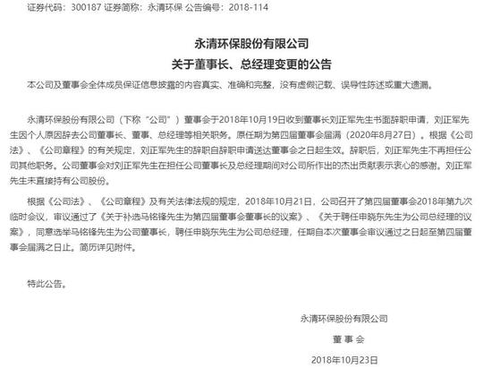 此后,2018年10月,永清环保正式发布董事长、总经理变更的公告,称刘正军因个人原因辞去职务,申晓东正式聘任为总经理。值得一提的是,申晓东也已于今年7月19日辞职。