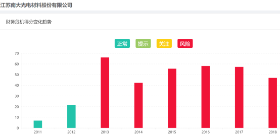 根据红岸风险挖掘系统显示,南大光电自从2013年以来财务危机得分均为“风险”,近两年财务危机得分略有下降,但2018年得分为46.93,仍处于“风险”等级。