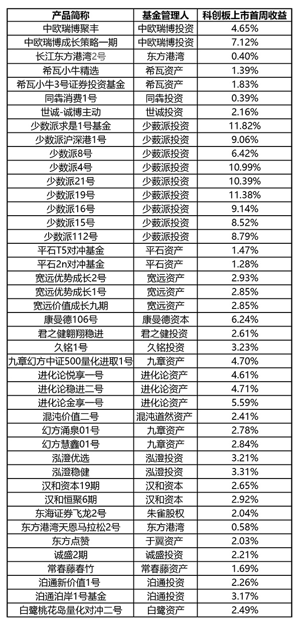 此外,康曼德资本、进化论资产、九章资产、泊通投资旗下参与打新的基金产品在科创板交易首周的净值表现也有不俗表现。
