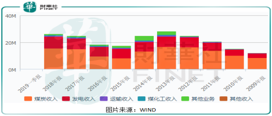 从中国神华的收入构成来看,根据WIND统计数据,公司近十年的营业收入主要由煤炭收入(能源)和发电收入(公共事业)组成(占总收入90%上下),而煤炭收入在近十年大部分时间占到公司总收入50%上下,发电收入在近十年大部分时间也可以占到总收入的40%上下。