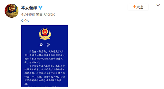 因侦查工作需要,我局原定于8月1日上午召开的释永旭涉黑恶犯罪团伙主要成员公开指认现场揭发检举动员大会,暂时取消。