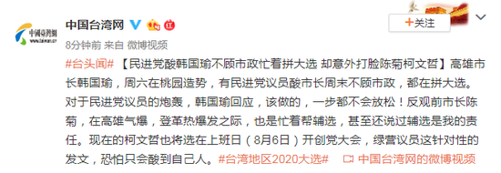 #台头闻# [民进党酸韩国瑜不顾市政忙着拼大选 却意外打脸陈菊柯文哲]高雄市长韩国瑜,周六在桃园造势,有民进党议员酸市长周末不顾市政,都在拼大选。对于民进党议员的炮轰,韩国瑜回应,该做的,一步都不会放松!反观前市长陈菊,在高雄气爆,登革热爆发之际,也是忙着帮辅选,甚至还说过辅选是我的责任。现在的柯文哲也将选在上班日(8月6日)开创党大会,绿营议员这针对性的发文,恐怕只会酸到自己人。#台湾地区2020大选#