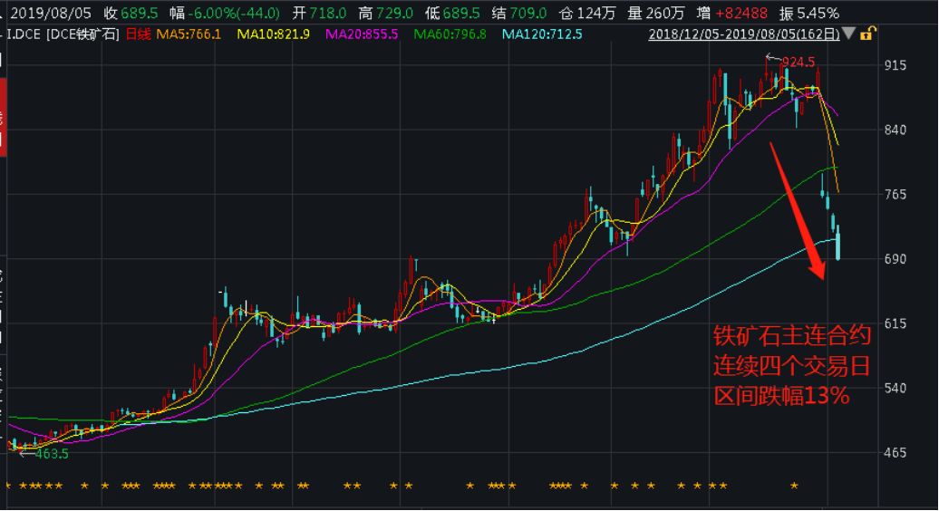 8月5日开盘,铁矿石价格大幅下跌,铁矿石期货领跌商品市场,其合约铁矿石1910、铁矿石2001、铁矿石1911均在早盘出现大跌后,跌幅一路扩大。