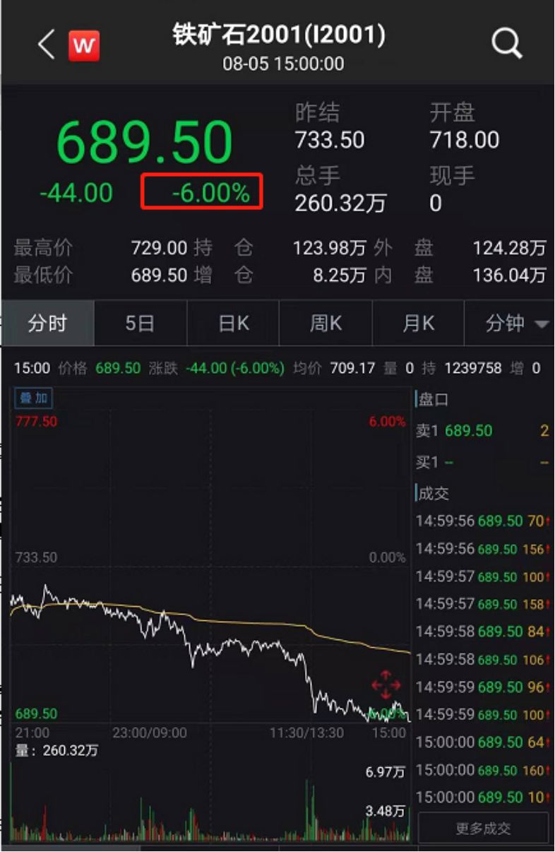 8月5日,大商所铁矿石期货领跌内盘商品期货市场,主力合约2001早盘低开后,价格一路下跌。截至当日收盘,铁矿石期货主力合约跌停,价格报收689.5元/吨。