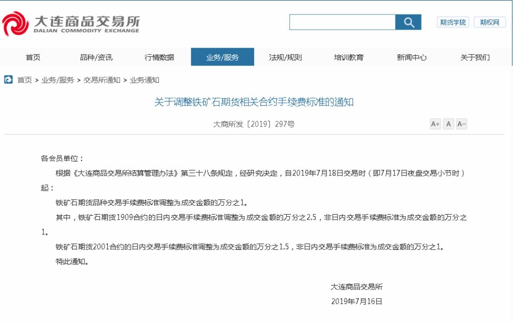 7月16日,大商所发布通知,自2019年7月18日交易时(即7月17日夜盘交易小节时)起:铁矿石期货品种交易手续费标准调整为成交金额的万分之1。其中,铁矿石期货1909合约的日内交易手续费标准调整为成交金额的万分之2.5,非日内交易手续费标准为成交金额的万分之1。铁矿石期货2001合约的日内交易手续费标准调整为成交金额的万分之1.5,非日内交易手续费标准为成交金额的万分之1。