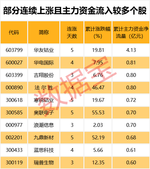 值得注意的是,158只连续上涨个股中,12只个股期间主力资金累计净流入超过5000万元。其中,累计资金流入最多的为华友钴业,主力资金累计流入4.13亿元。