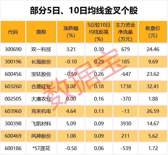 截至8月1日收盘,有9只A股的5日均线主动上穿10日均线,其中双一科技、长海股份、宝钛股份等个股的5日均线较10日均线距离最大,分别达0.3%、0.29%、0.26%。值得注意的是,飞凯材料、合盛硅业、双一科技等个股主力资金净流入居前。