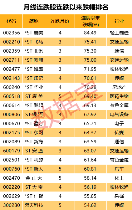 具体到个股方面,跌幅最大的是*ST赫美,该股月线4连跌,累计跌幅高达84.49%。*ST飞马、*ST北讯等15股连跌以来累计跌幅超过60%。也有一些股票跌幅相对较小的,兰太实业、承德露露、浙江东日等累计跌幅不足10%。