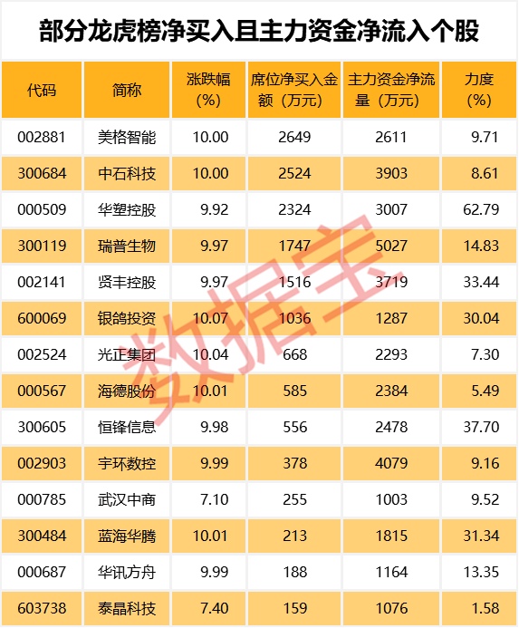 从盘口资金流向来看,主力资金净流入超千万且龙虎榜净买入个股共有14只,其中瑞普生物、宇环数控、中石科技等个股资金净流入金额最大。净流入力度最大的个股有华塑控股、恒锋信息、贤丰控股,净流入力度分别为62.79%、37.7%、33.44%。
