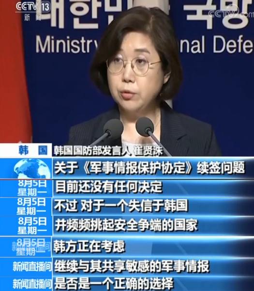 韩国国防部发言人 崔贤洙:关于《军事情报保护协定》续签问题目前还没有任何决定。不过,对于一个失信于韩国并频频挑起安全争端的国家,韩方正在考虑继续与其共享敏感的军事情报是否是一个正确的选择。