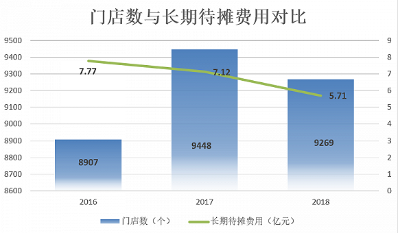 数据显示,2017年分摊在销售费用中的租赁费为10.48亿元,同比下降2%,而门店数却净增加500余家。2018年的情况也是如此,租赁费上涨0.6%,实际上门店数却下降179家。