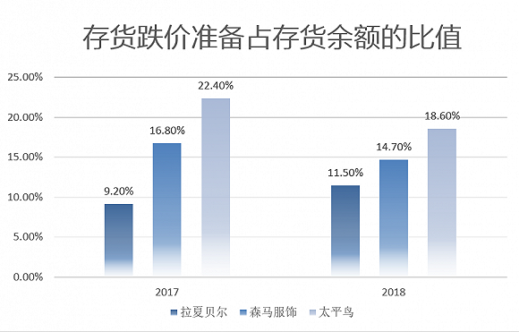 因为服装受流行趋势的影响很大,一旦出现滞销,服装企业通常会给予较大折扣,处理存货,回笼资金。因而,服装公司销售下滑后,存货跌价往往是随之而来的风险。从2016年起,拉夏贝尔的存货就一直上升,到2018年已达28亿元。但是账上只有3.3亿元的存货跌价准备。2018年和2017年,拉夏贝尔存货跌价准备与存货账面余额的比值分别为11.5%和9.2%。森马服饰2018年、2017年该比例分别为14.7%和16.8%。太平鸟2018年、2017年该比例分别为18.6%和22.4%。