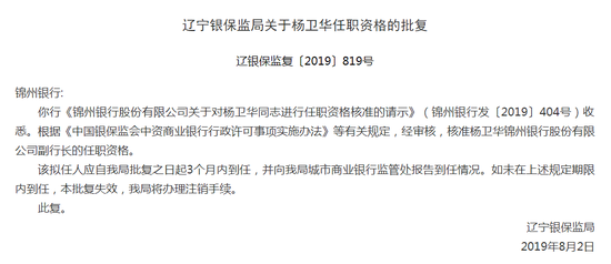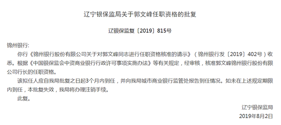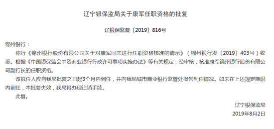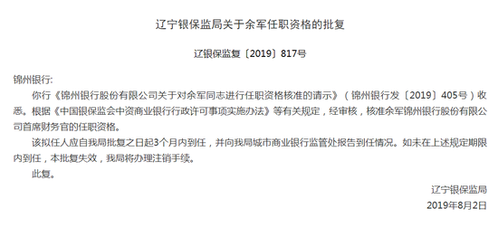 新浪财经讯 8月5日消息,辽宁银保监局网站显示,辽宁银保监局已于8月2日分别批复同意郭文峰、康军、杨卫华、余军担任锦州银行行长、副行长、副行长、首席财务官的任职资格。