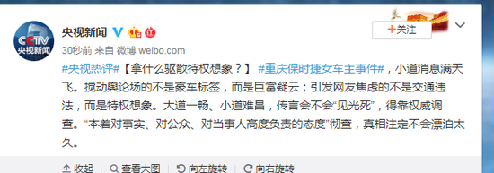 [拿什么驱散特权想象?] #重庆保时捷女车主事件#,小道消息满天飞。搅动舆论场的不是豪车标签,而是巨富疑云;引发网友焦虑的不是交通违法,而是特权想象。大道一畅、小道难昌,传言会不会“见光死”,得靠权威调查。“本着对事实、对公众、对当事人高度负责的态度”彻查,真相注定不会漂泊太久。